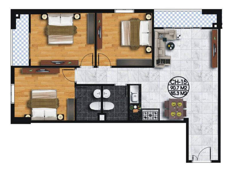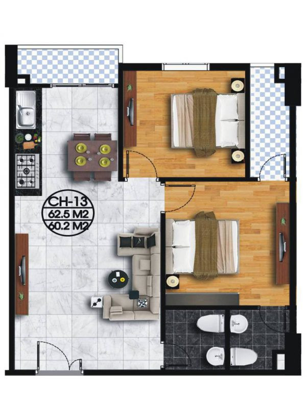 Các căn hộ Green View 3 có diện tích đa dạng từ 62.5m2, 66m2, 67m2, 73m2, 85m2 đến 90m2, bao gồm 2-3 phòng ngủ, 2 ban công và 2 nhà vệ sinh.