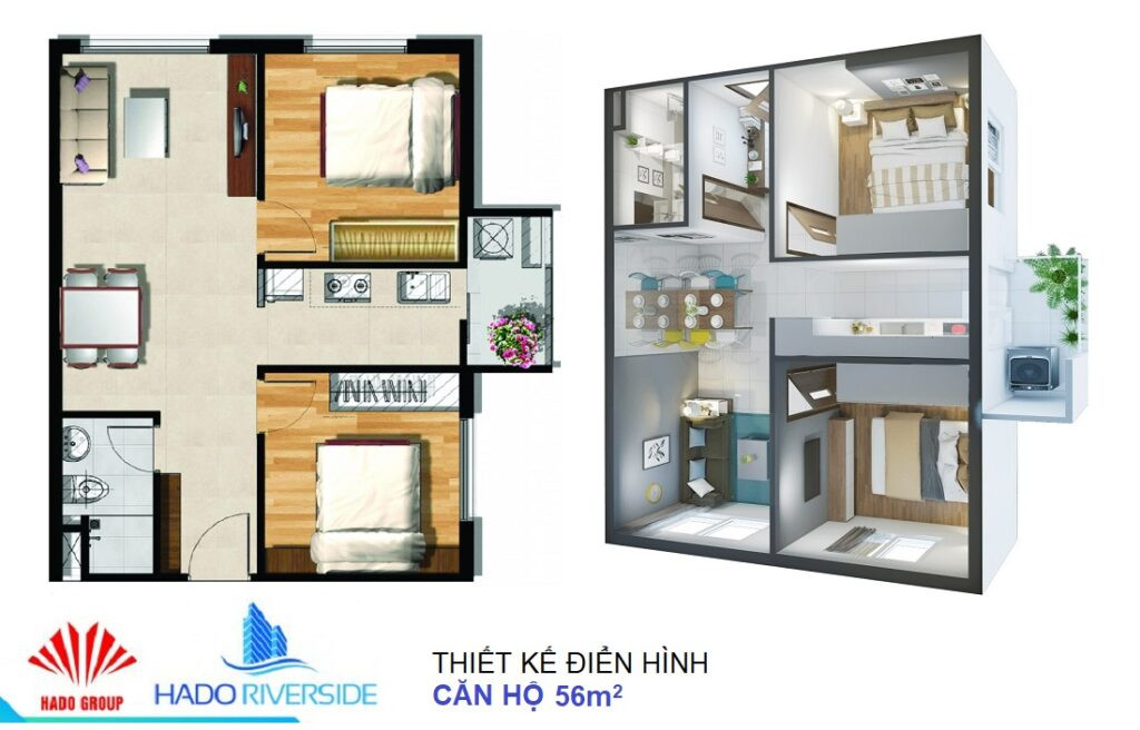 Đối với căn hộ 2PN có diện tích 56m2, điểm đặc biệt trong thiết kế của căn hộ Hà Đô Riverside là tất cả các căn đều được bố trí ở vị trí góc, tối đa hóa tầm nhìn và khả năng đón sáng, thông gió từ nhiều hướng. Điều này tạo nên không gian sống rộng rãi, thoáng đãng và đẳng cấp hơn. Các mặt bằng chi tiết của shophouse và các tầng căn hộ cũng thể hiện sự khoa học trong cách bố trí không gian, đảm bảo tính thẩm mỹ và công năng sử dụng.