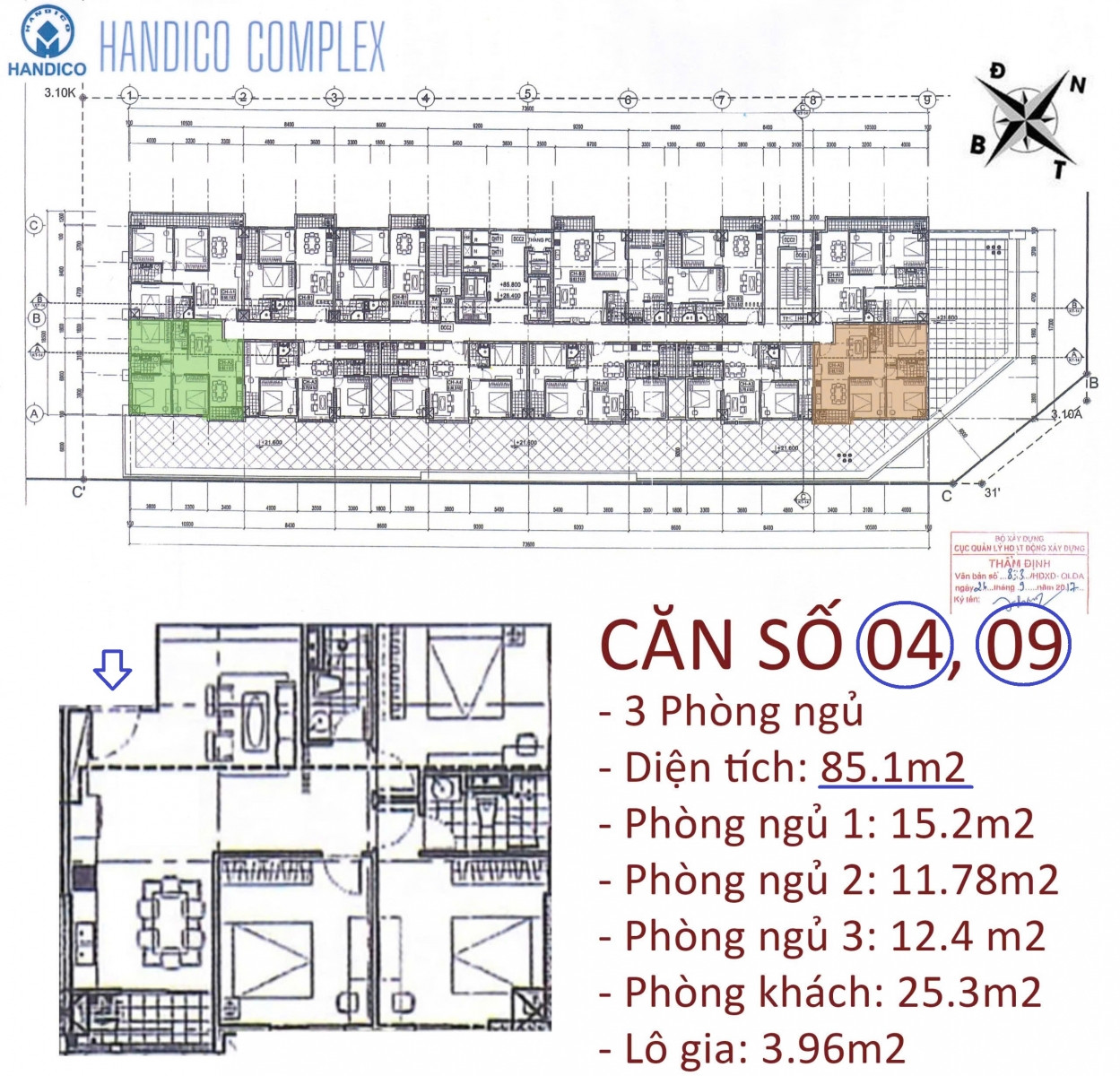 Mặt bằng căn góc 3 phòng ngủ 85m2 chung cư Handico Complex Lê Văn Lương