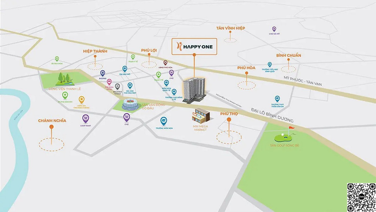 Vị trí của dự án Happy One Bình Dương là một trong những yếu tố then chốt tạo nên giá trị và sức hấp dẫn của dự án. Nằm ngay mặt tiền Đại lộ Bình Dương, tuyến đường huyết mạch của tỉnh, cư dân dễ dàng di chuyển đến các khu vực trung tâm khác và kết nối nhanh chóng với TP. Hồ Chí Minh. Đây là khu vực có tốc độ đô thị hóa nhanh chóng, tập trung nhiều cơ quan hành chính, trung tâm thương mại và dịch vụ, tạo nên một cộng đồng dân cư văn minh và năng động.