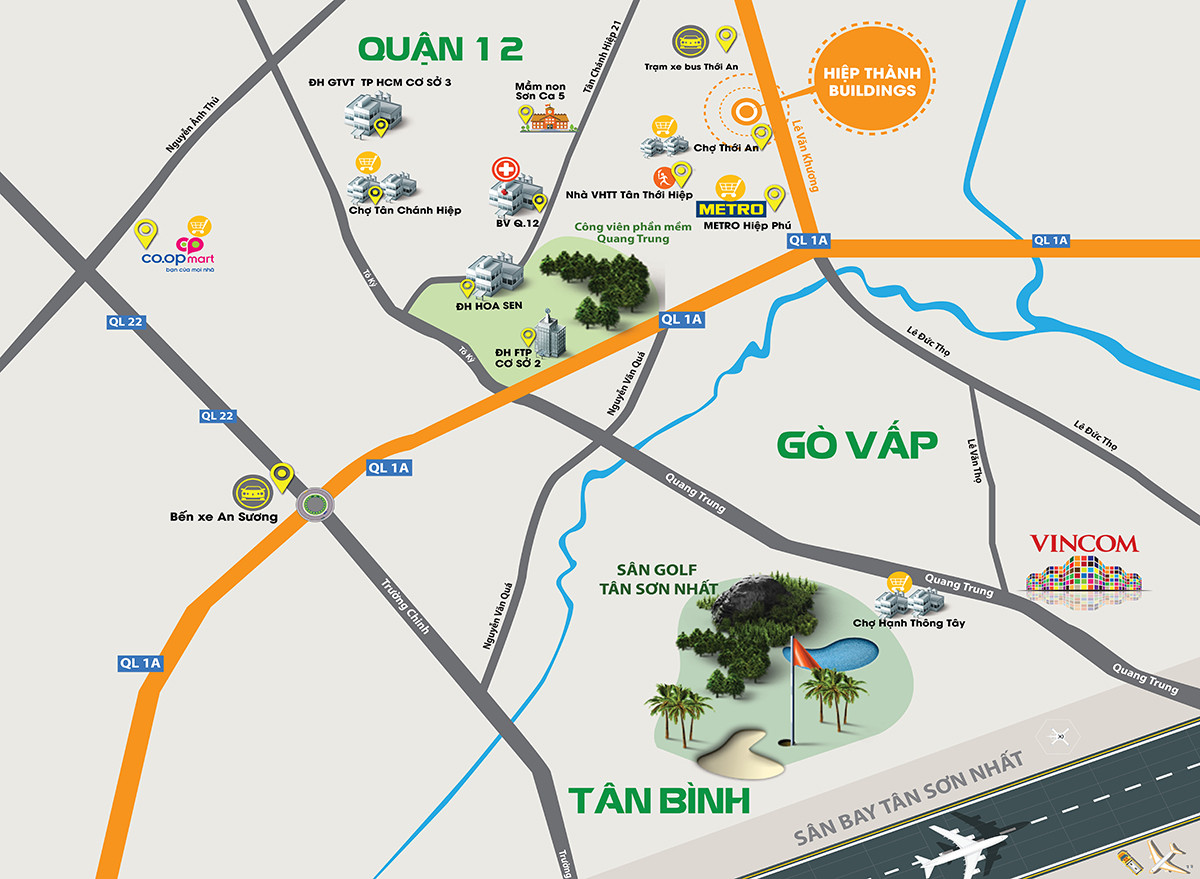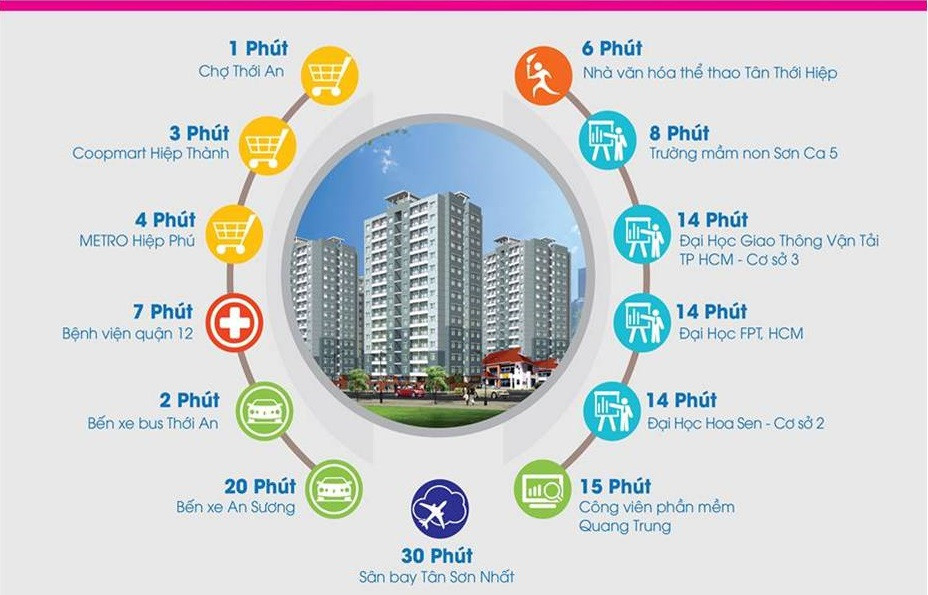 Từ chung cư Hiệp Thành, cư dân dễ dàng kết nối đến các khu vực trọng điểm. Cạnh tuyến xe buýt chính Thới An, việc đi lại trong thành phố trở nên vô cùng tiện lợi. Dự án cũng là cầu nối lý tưởng đến các quận trung tâm lân cận như Tân Bình, Gò Vấp, và Tân Phú chỉ trong khoảng thời gian di chuyển ngắn. Đặc biệt, khu vực này còn gần với các tiện ích lớn như siêu thị Metro, UBND Quận 12, Coop Mart và Khu công nghệ phần mềm Quang Trung, đáp ứng mọi nhu cầu mua sắm, hành chính và làm việc của cư dân.