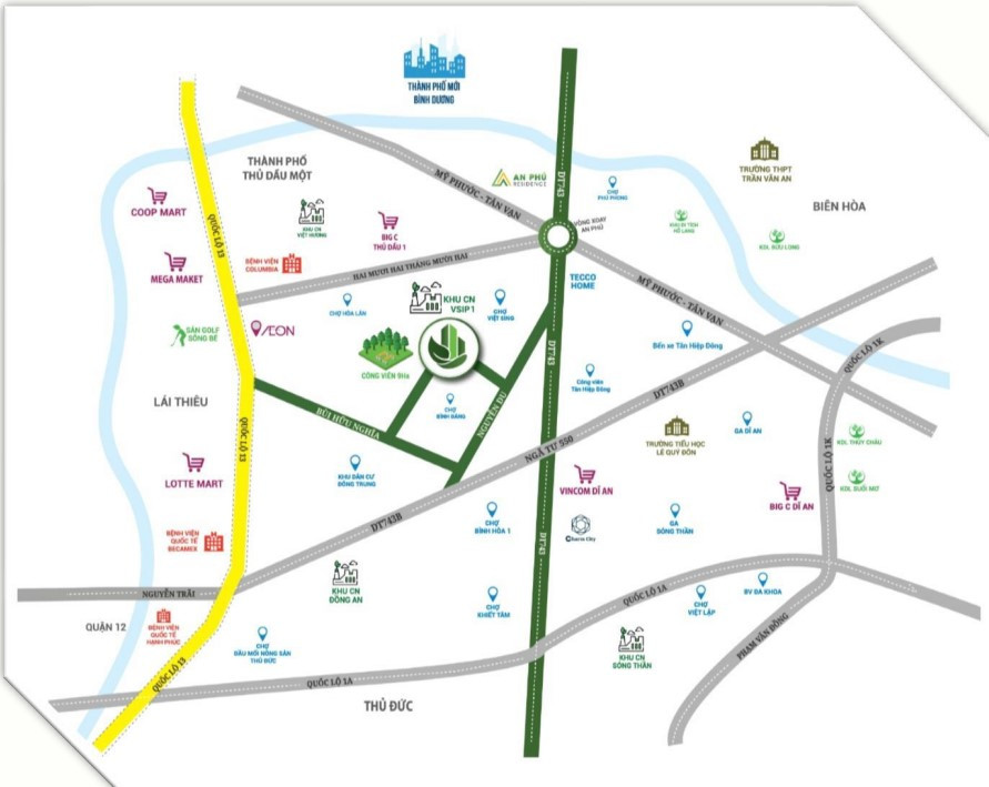 Sự kết nối giao thông linh hoạt cho phép cư dân dễ dàng di chuyển đến các trung tâm kinh tế lớn như Thành phố Hồ Chí Minh, Thủ Dầu Một, hay Dĩ An một cách nhanh chóng. Hơn nữa, dự án còn nằm gần kề hàng loạt tiện ích ngoại khu cao cấp, bao gồm các trung tâm thương mại lớn như Aeon Mall, Lotte Mart, Vincom, cùng với các dịch vụ y tế chất lượng như Bệnh viện Quốc tế Becamex và các khu giải trí như Sân Golf Sông Bé. Những tiện ích này tạo nên một môi trường sống tiện nghi và trọn vẹn cho cộng đồng dân cư.