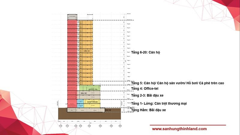 Dự án cung cấp căn hộ 1 phòng ngủ (51,41m2 – 53,16m2), căn hộ 2 phòng ngủ (56m2 – 77m2) và căn hộ 3 phòng ngủ (86,74m2 – 96,16m2), cùng với các căn Officetel và Shophouse thương mại.