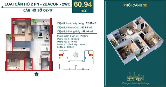 - DTXD: 60.94m2 – DTTT: 57.46m2 (Vị trí: 02, 17)