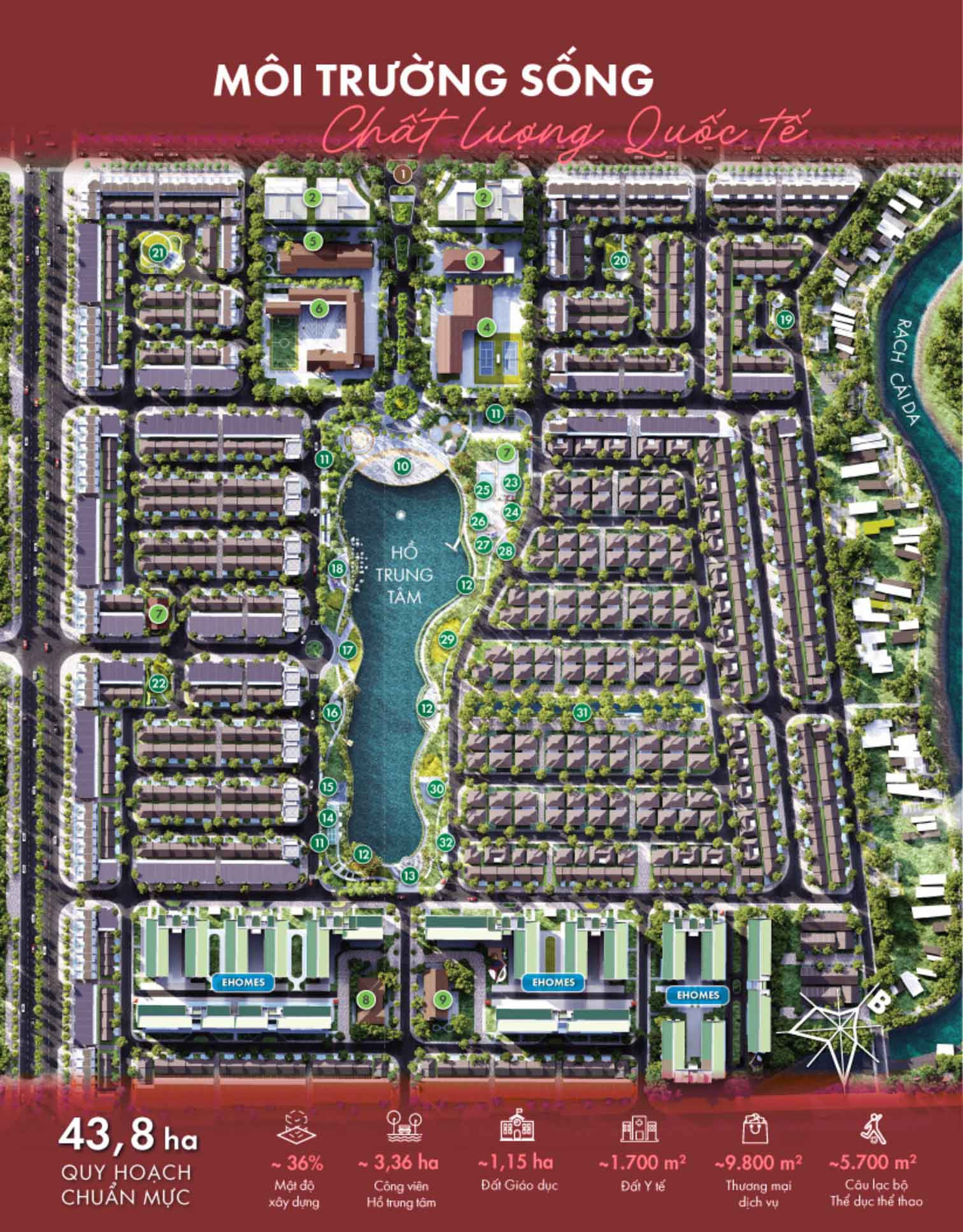 Điểm nổi bật nhất về tiện ích là hệ thống hơn 30 tiện ích đẳng cấp cùng với hồ sinh thái và công viên trung tâm rộng gần 34.000m2, tạo nên môi trường sống xanh và hiện đại.