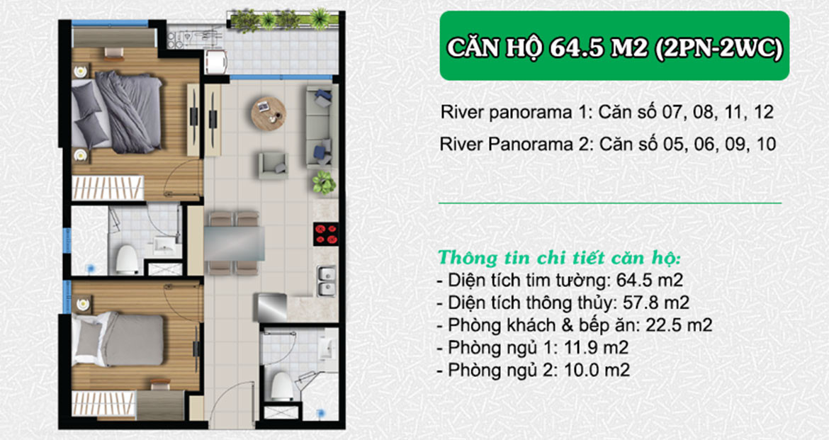 Thiết kế chi tiết căn hộ 2 phòng ngủ – 2wc diện tích 63,8m2