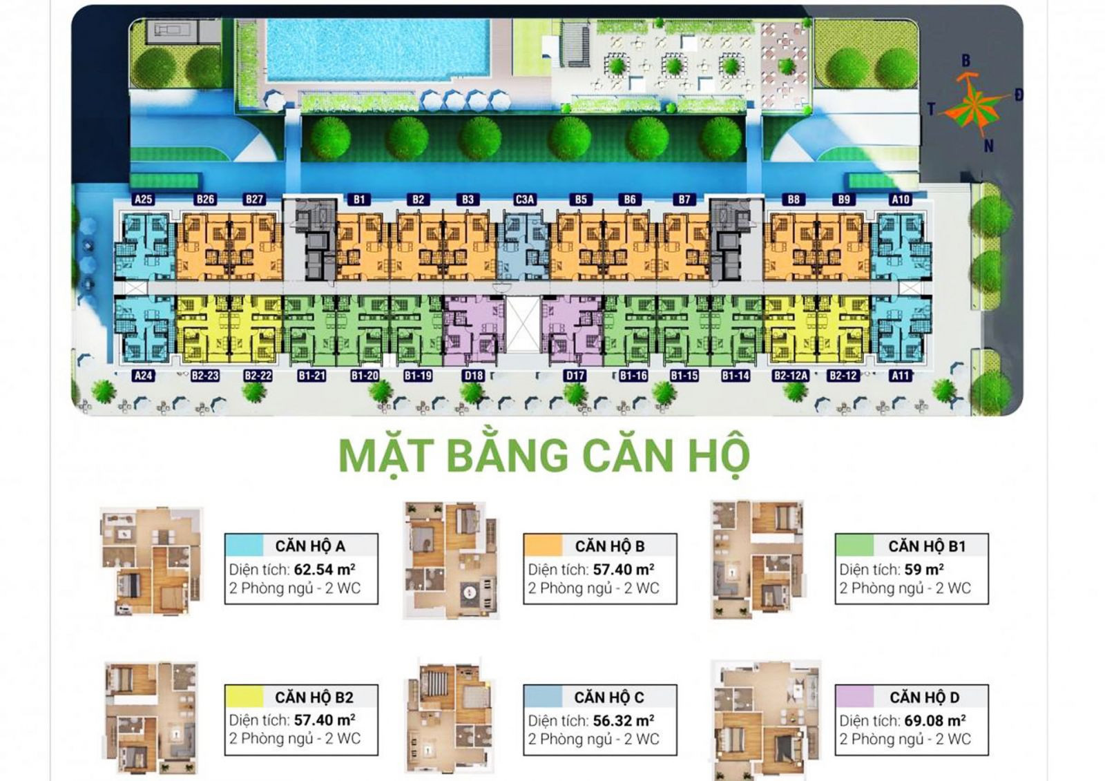 Các căn hộ tại đây có diện tích đa dạng từ 56m2 đến 69m2, được thiết kế với 2 đến 3 phòng ngủ, phù hợp với nhu cầu của các gia đình trẻ, cặp vợ chồng hay những gia đình đa thế hệ. Tầng 1 và tầng 2 của tòa nhà dành cho khu dịch vụ, thương mại và sinh hoạt cộng đồng, trong khi các tầng từ 3 đến 18 là khu căn hộ được bố trí khoa học, tối ưu công năng sử dụng. Ngoài ra, việc kết hợp với 550 căn nhà phố liền kề trong khu đô thị Hiệp Thành City còn tạo nên một cộng đồng dân cư văn minh, sôi động và gắn kết.