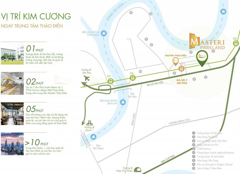 Đối với những ai làm việc hoặc muốn khám phá trung tâm thành phố, việc đến Quận 1 chỉ mất khoảng 10 phút qua Xa Lộ Hà Nội và Cầu Sài Gòn, hoặc 10 phút để đến Thủ Thiêm, Quận 2, qua tuyến Mai Chí Thọ. Ngoài ra, dự án căn hộ Parkland còn nằm gần Tuyến Metro số 1 Bến Thành – Suối Tiên, chỉ cách 3 phút di chuyển, mang lại một phương án giao thông công cộng hiện đại và tiện lợi, góp phần giảm thiểu áp lực giao thông đô thị và nâng cao chất lượng sống cho cư dân.