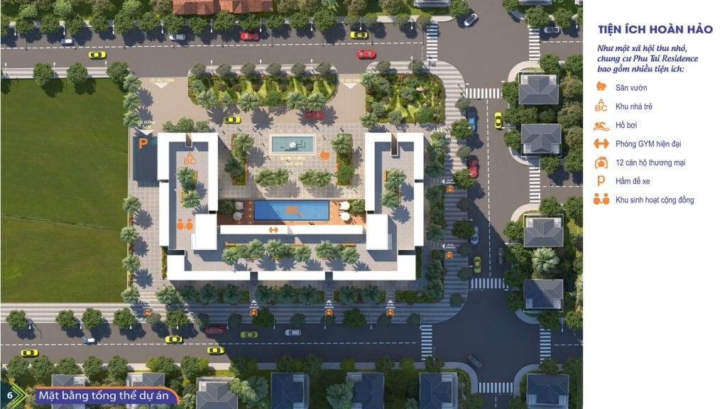 Phú Tài Residence cung cấp đa dạng tiện ích nội khu như hồ bơi tại tầng 3, phòng tập GYM hiện đại, khuôn viên sân vườn dành cho trẻ em, và khu shophouse với nhiều nhà hàng, quán cà phê sang trọng. Các tiện ích này được thiết kế để phục vụ mọi nhu cầu sống, giải trí và làm việc của cư dân.