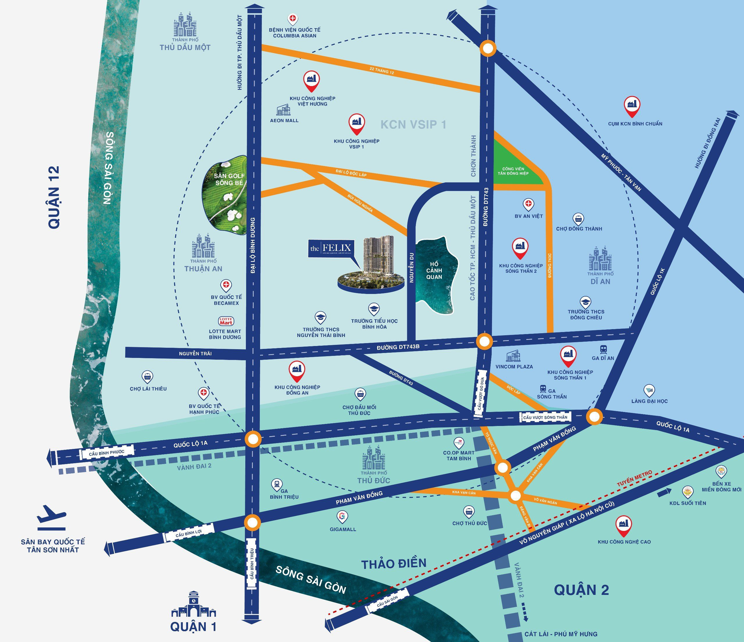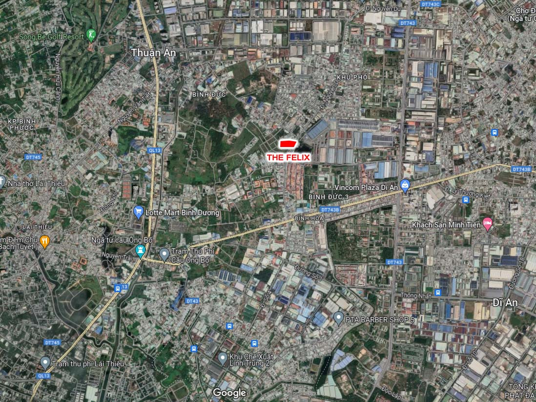 Dự án The Felix Thuận An, được phát triển bởi Quốc Cường Gia Lai, tọa lạc tại đường Nguyễn Du, Bình Hòa, TP. Thuận An, tỉnh Bình Dương. Vị trí này không chỉ thuận lợi cho việc di chuyển mà còn nằm trong quy hoạch phát triển của Thuận An, hướng tới mục tiêu trở thành đô thị thông minh loại I giai đoạn 2021 – 2025. Sự mở rộng các tuyến đường huyết mạch như Đại Lộ Bình Dương và Đại lộ Mỹ Phước – Tân Vạn càng củng cố vị thế chiến lược của chung cư Quốc Cường Gia Lai này.