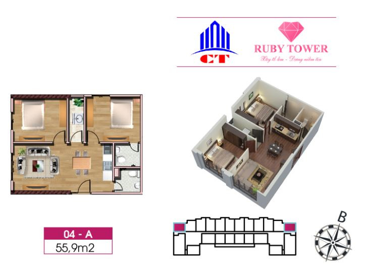 Căn hộ 2 phòng ngủ tại Ruby Tower Thanh Hóa có nhiều loại diện tích, phổ biến từ 55.9m2 đến 79.35m2.