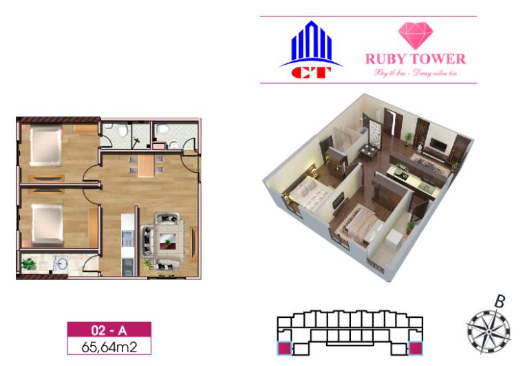Thiết kế căn hộ 2 phòng ngủ 65.64m2 chung cư Ruby Thanh Hóa
