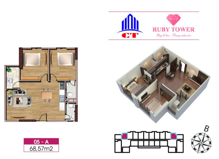 Thiết kế căn hộ 2 phòng ngủ 68.57m2 chung cư Ruby Thanh Hóa