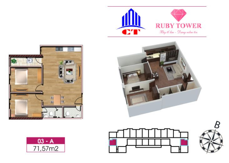 Thiết kế căn hộ 2 phòng ngủ 71.57m2 chung cư Ruby Thanh Hóa