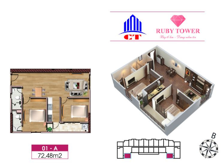 Thiết kế căn hộ 2 phòng ngủ 72.48m2 chung cư Ruby Thanh Hóa