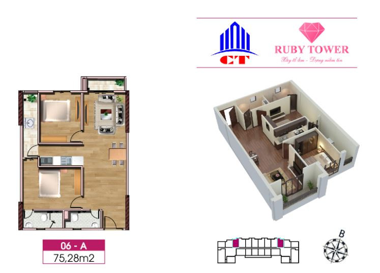 Thiết kế căn hộ 2 phòng ngủ 75.28m2 chung cư Ruby Thanh Hóa