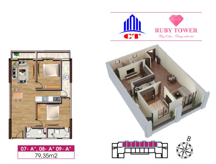 Thiết kế căn hộ 2 phòng ngủ 79.35m2 chung cư Ruby Thanh Hóa