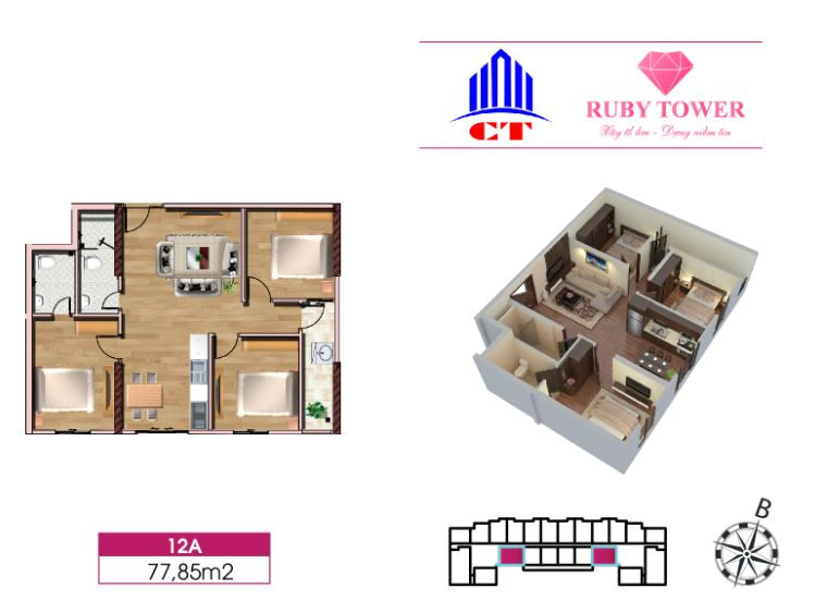 Căn hộ 3 phòng ngủ (77.85m2) tại Ruby Thanh Hóa mang đến một không gian rộng rãi và riêng tư hơn, rất phù hợp cho các gia đình đông thành viên hoặc những ai cần không gian làm việc tại nhà. Căn hộ này bao gồm phòng khách liền bếp rộng 30.59m2, ba phòng ngủ với diện tích từ 10.48m2 đến 12.54m2, hai nhà vệ sinh và một logia 5.05m2. Bố cục này tối ưu hóa việc sử dụng diện tích, tạo ra một môi trường sống thoải mái và ấm cúng cho mọi thành viên trong gia đình tại chung cư Ruby Tower Thanh Hóa.