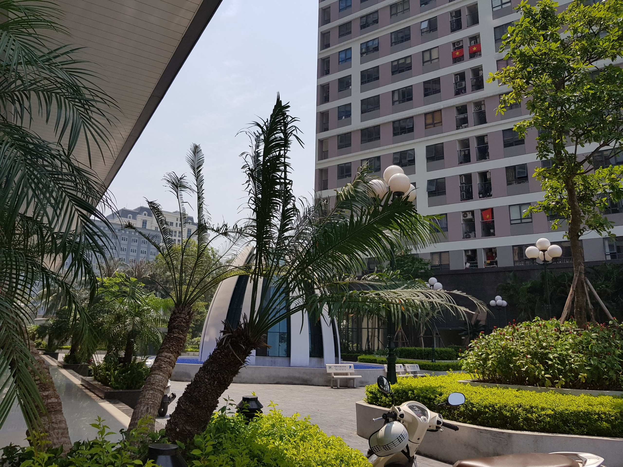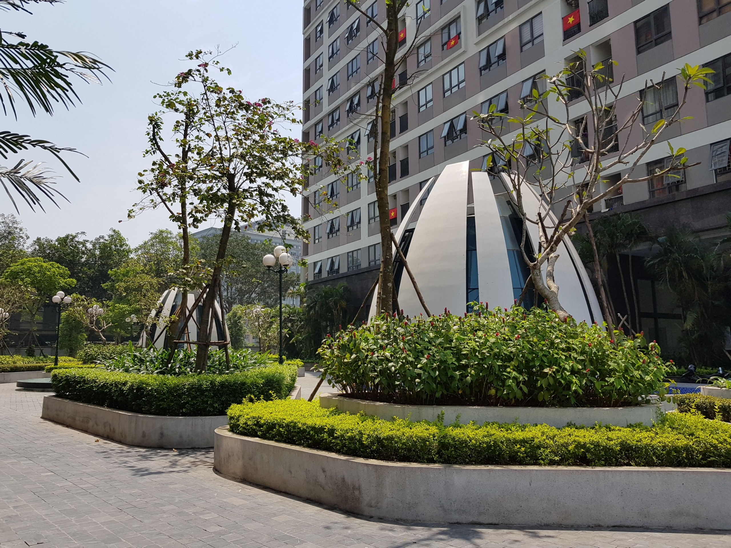 Khuôn viên xanh mát giữa các tòa căn hộ Epic Home, tạo không gian sống thân thiện cho cư dân chung cư Thái Hà Phạm Văn Đồng.