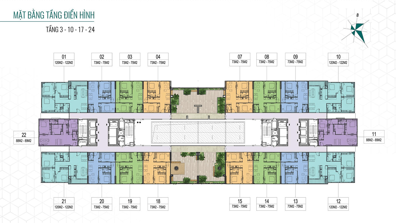 Khối căn hộ từ tầng 3 đến tầng 30 được thiết kế tối ưu, đảm bảo không gian sống thoáng đãng và tiện nghi. Các mặt bằng tầng điển hình bố trí 20 căn hộ/tầng, chia thành 02 đơn nguyên với 02 lõi thang giao thông đứng riêng biệt. Đặc biệt, các tầng 9, 13, 17, 21, 25, 29 còn có thiết kế sân vườn tại vị trí giữa hai đơn nguyên, mang lại không gian xanh mát độc đáo.