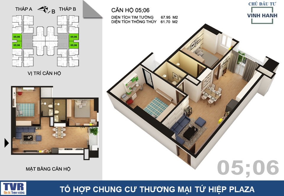 - Cụ thể, các căn hộ với ký hiệu CH1 (A05, A06, B05, B06) có 2 phòng ngủ, 2 vệ sinh, diện tích thông thủy 61,7 m2.
