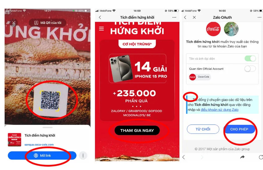 Bước 2: Mở ứng dụng Zalo trên điện thoại của bạn, chọn chức năng quét mã QR và quét mã hiển thị trên trang Cokeurl.com. Sau khi quét, chọn “Mở link” và sau đó “Tham gia ngay”. Bạn cần tích chọn “Tôi đồng ý” với các điều khoản và nhấn “Cho phép” để chương trình có thể thu thập thông tin cần thiết.