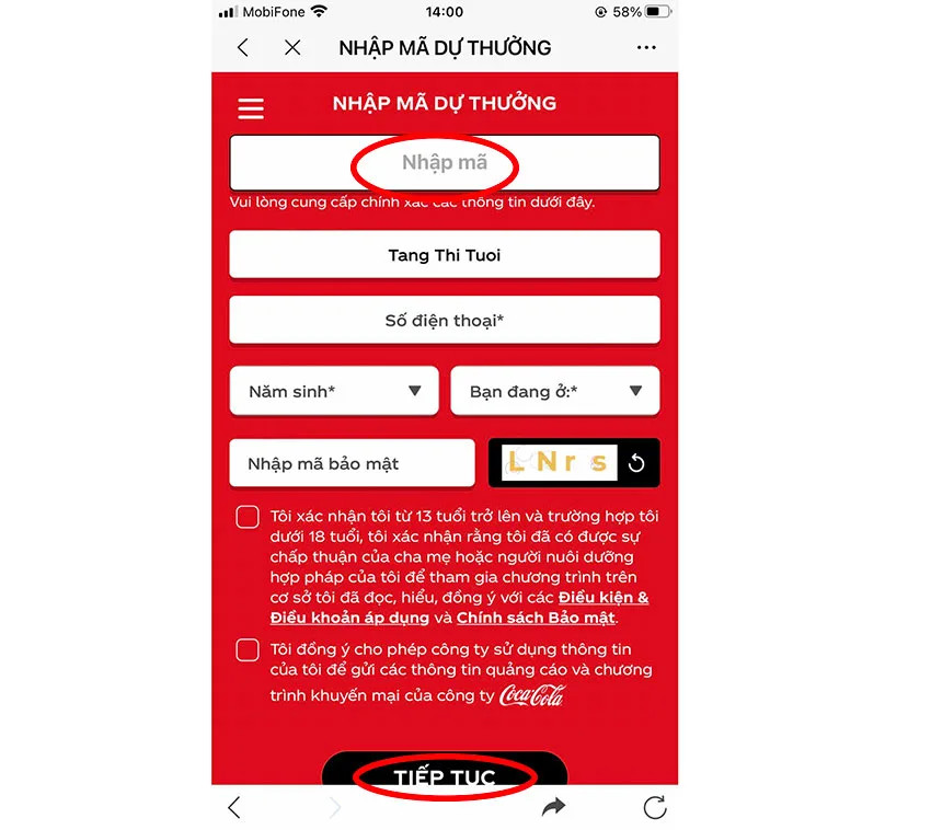 Bước 3: Sau khi cấp quyền, một giao diện sẽ hiện ra yêu cầu bạn nhập mã dự thưởng gồm 12 ký tự mà bạn đã tìm thấy dưới nắp chai hoặc khoen lon. Đồng thời, bạn cần điền các thông tin cá nhân cơ bản như số điện thoại, năm sinh, nơi ở và mã bảo mật được hiển thị trên màn hình. Hãy đảm bảo tích chọn vào các ô xác nhận “Tôi xác nhận…” và “Tôi đồng ý…” trước khi nhấn “Tiếp tục”.