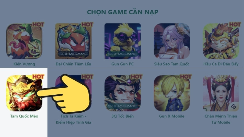 Bước 1: Truy cập vào trang web chính thức của hệ thống giftcode SohaGame dành cho Tam Quốc Mèo. Địa chỉ cụ thể là nap.sohagame.vn/tamquocmeo. Tại đây, bạn sẽ thấy giao diện chọn game và bắt đầu quá trình nhập code.