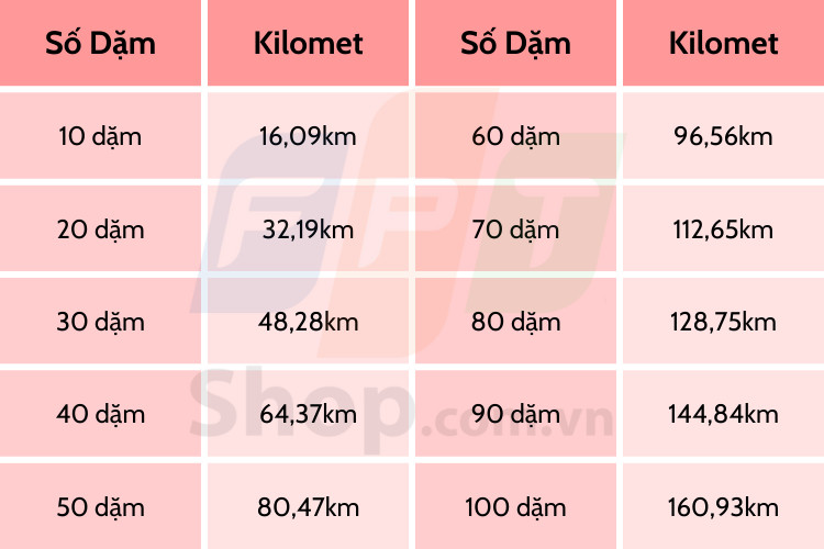Để thuận tiện cho việc tra cứu nhanh, dưới đây là bảng quy đổi một số giá trị dặm sang kilômét: