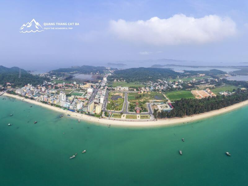 Phong cảnh đảo Cô Tô nhìn từ trên cao với bãi biển cát trắng và thuyền neo đậu