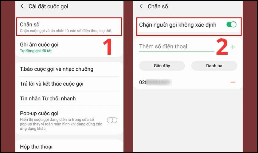 Cài đặt chặn cuộc gọi không xác định, bao gồm đầu số 02888 - Bước 3: Chọn mục “Chặn số” (hoặc “Blocked numbers”) và bật tùy chọn “Chặn người gọi không xác định” (hoặc “Block unknown callers”).
