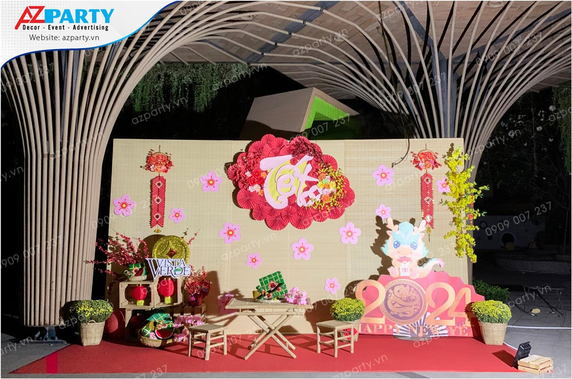 Tiểu cảnh Tết truyền thống tại sảnh chung cư với decal phối hợp