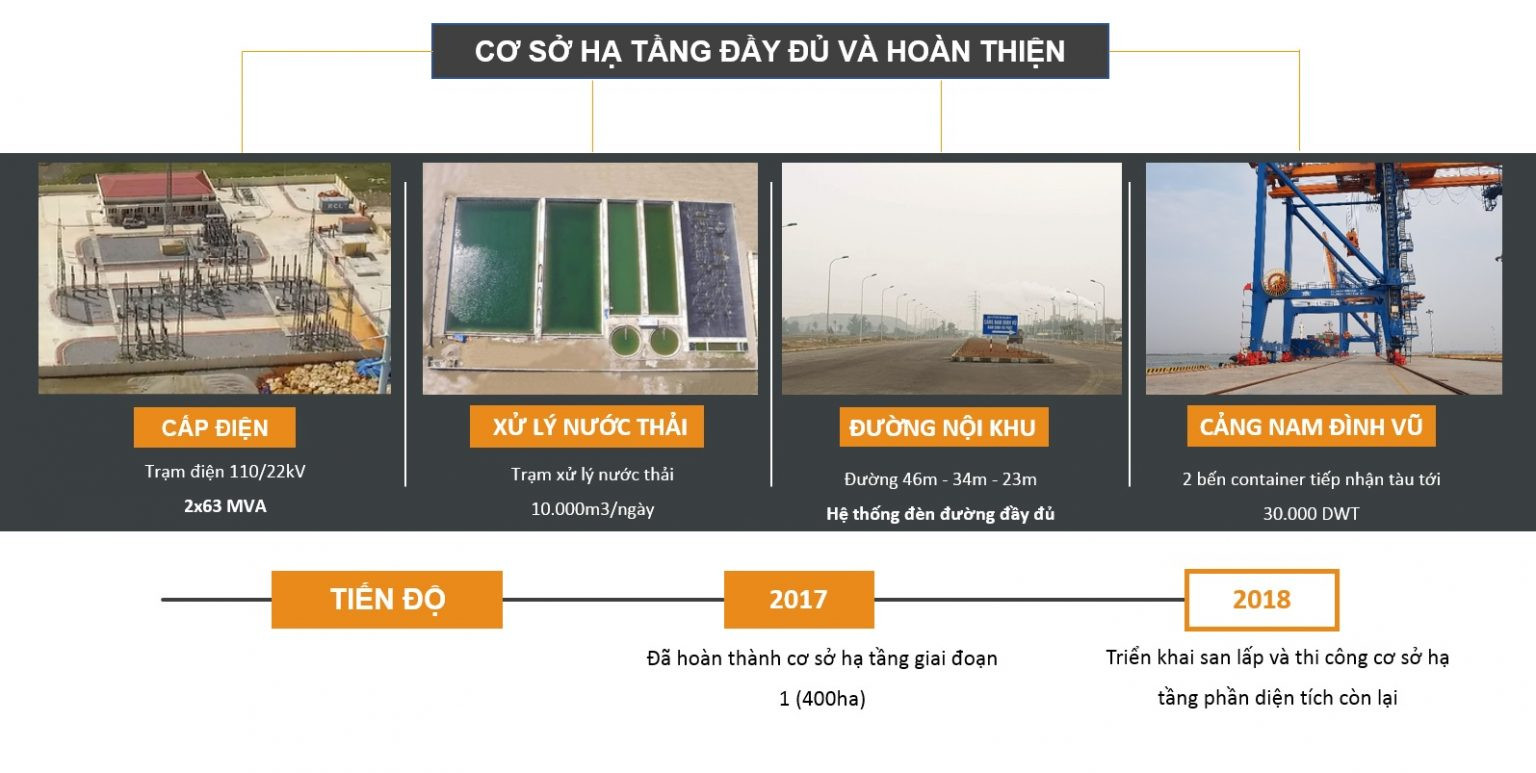KCN Nam Đình Vũ sở hữu hạ tầng đồng bộ và hiện đại với 4 phân khu chức năng (cảng biển, phi thuế quan, cảng dầu khí, khu công nghiệp), hệ thống PCCC tiên tiến, cấp điện ổn định (4 x 63 MVA), cấp nước (30.000 m3/ngày đêm), xử lý nước thải (10.000 m3/ngày) và cảng nội khu tiếp nhận tàu 40.000 DWT.