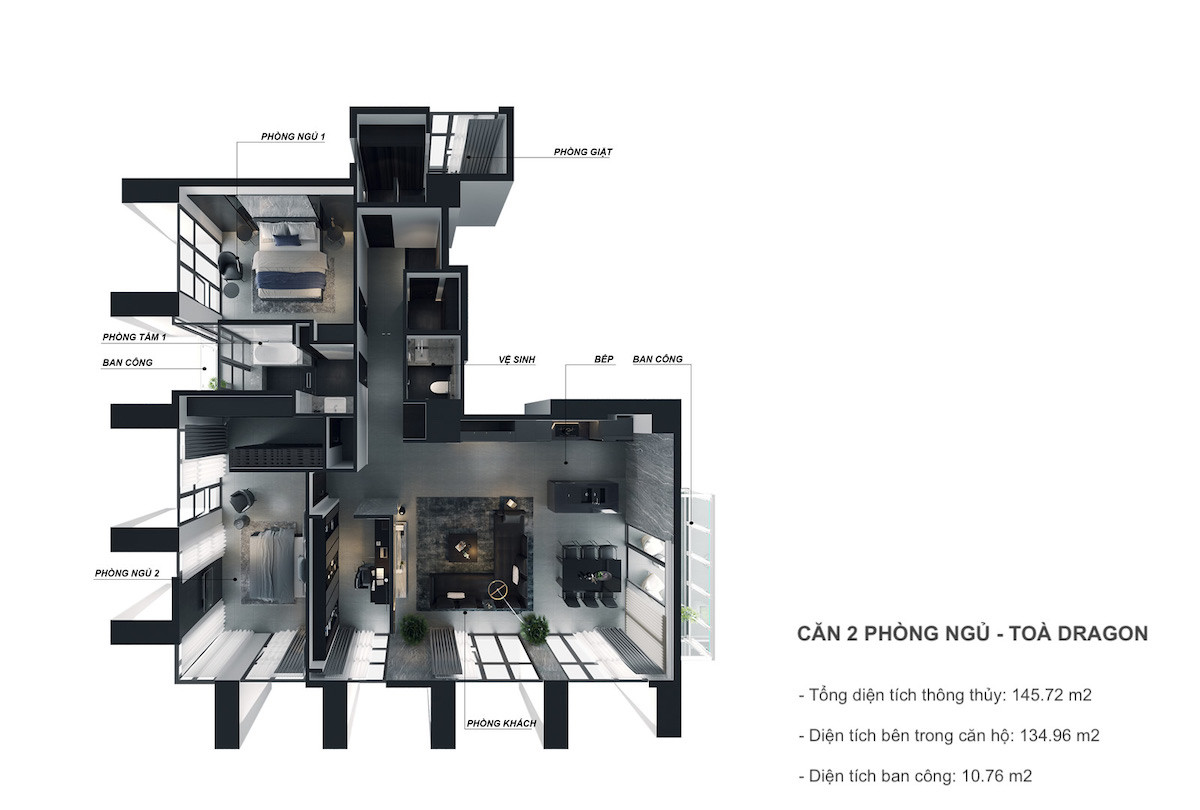Bố trí mặt bằng căn hộ 2 phòng ngủ cao cấp tại tòa Dragon của dự án Landmark Đà Nẵng.