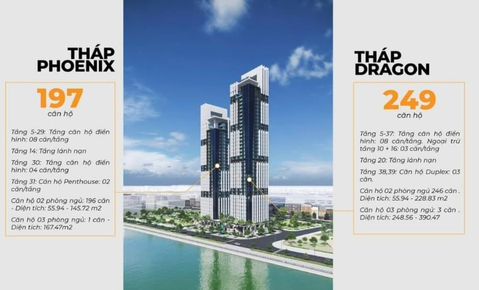 Tháp Dragon, với chiều cao vượt trội, cũng cung cấp nhiều loại hình căn hộ hấp dẫn. Từ tầng 5 đến tầng 37 là các tầng căn hộ điển hình, với 08 căn trên mỗi tầng, ngoại trừ tầng 10 và 16 có 03 căn hộ trên mỗi tầng, tạo điểm nhấn kiến trúc và không gian sống riêng biệt. Tầng 20 cũng là tầng lánh nạn, tương tự như Tháp Phoenix, nhấn mạnh yếu tố an toàn. Tầng 38 và 39 là nơi tọa lạc của các căn hộ Duplex sang trọng, với 03 căn trên mỗi tầng, mang đến không gian sống thông tầng độc đáo và đẳng cấp. Tổng số căn hộ tại Tháp Dragon là 249 căn. Trong đó, có 246 căn hộ 02 phòng ngủ với diện tích dao động từ 55.94 m2 đến 228.83 m2, và 03 căn hộ 03 phòng ngủ rộng lớn từ 248.46 m2 đến 390.47 m2. Sự đa dạng về diện tích và loại hình tại dự án Landmark Đà Nẵng này mang lại nhiều lựa chọn cho mọi đối tượng khách hàng.