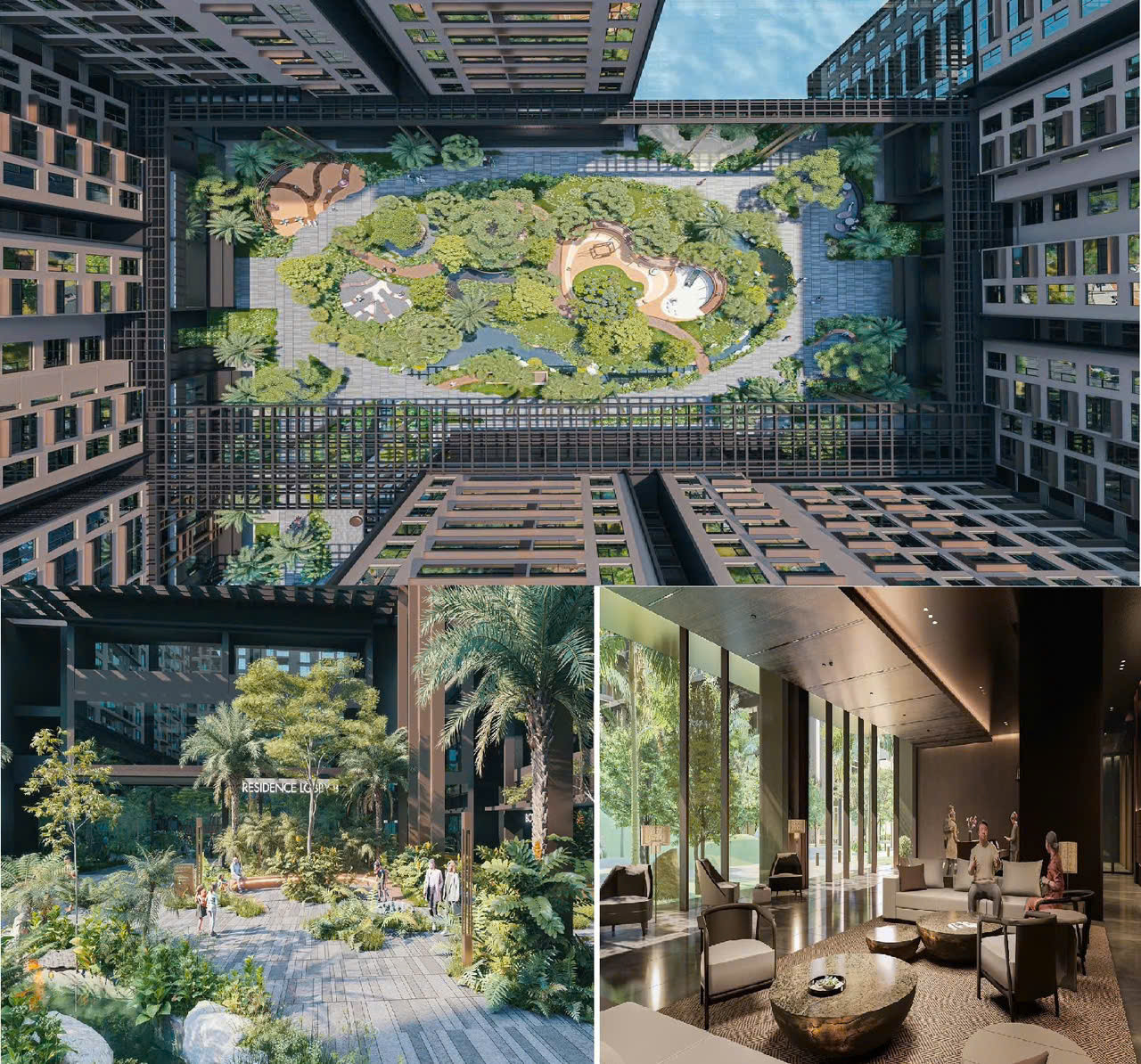 • Khu vào: Lối vào dự án với hệ thống an ninh 3 lớp, hàng rào cây xanh và sảnh đón tiếp sang trọng.