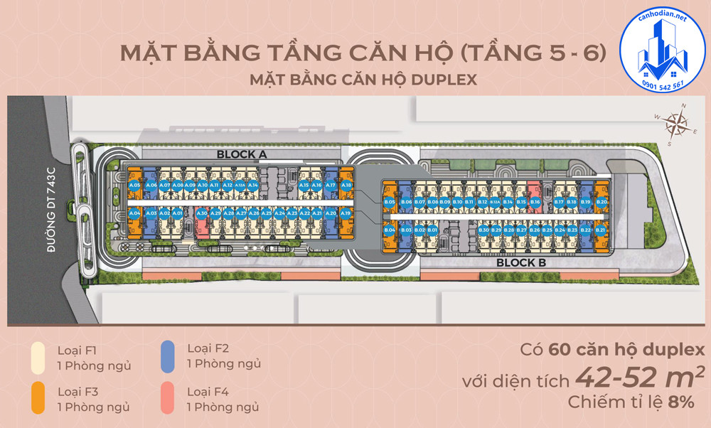 Dự án cung cấp đa dạng loại căn hộ với diện tích linh hoạt, phù hợp với nhiều nhu cầu và khả năng tài chính khác nhau. Các căn hộ Duplex có diện tích từ 42m² đến 52,9m², lý tưởng cho người độc thân hoặc các cặp đôi trẻ muốn trải nghiệm không gian sống độc đáo. Các căn hộ 1 phòng ngủ+ 1WC rộng 55,7m² đến 62,5m² mang đến không gian sống thoải mái hơn với khu vực sinh hoạt chung riêng biệt, có thể linh hoạt chuyển đổi công năng.