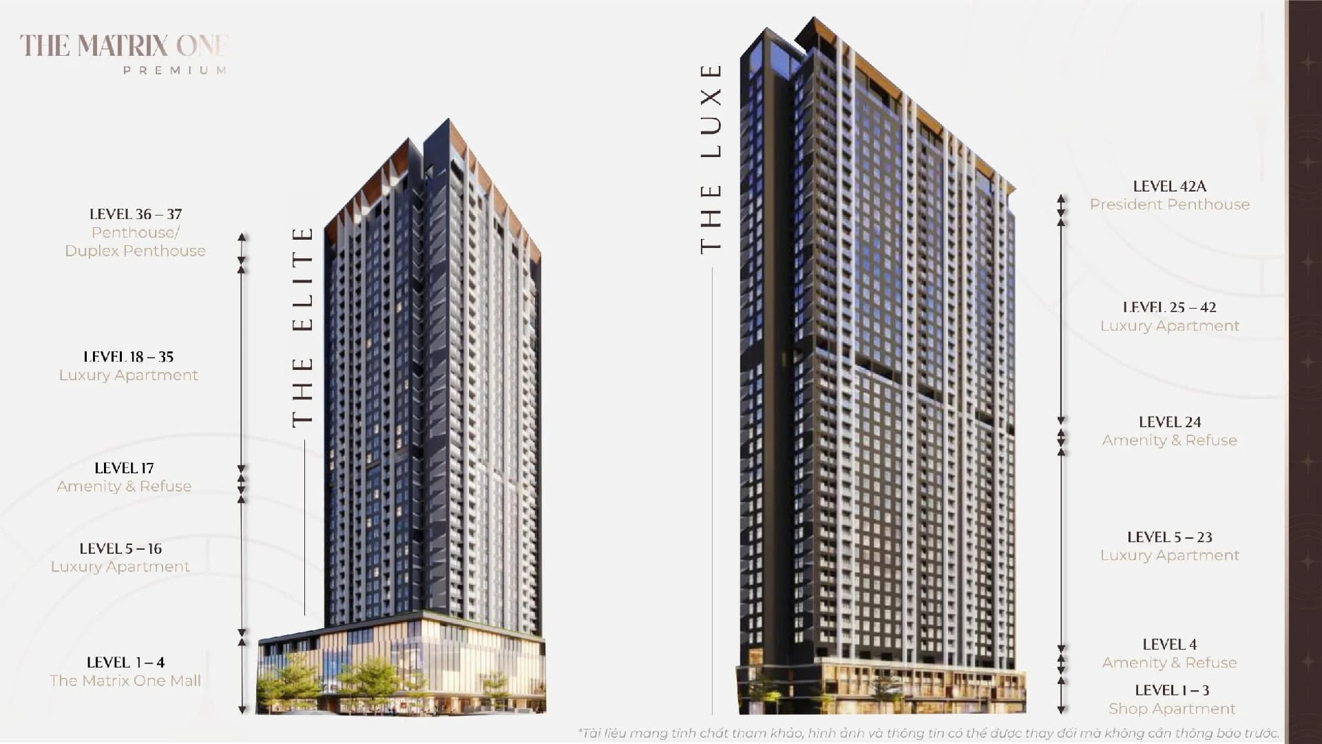 Tòa The Lux trong The Matrix One Premium được thiết kế với nhiều loại hình căn hộ trên các tầng khác nhau. Từ tầng 5 đến tầng 42, mỗi mặt sàn đều có cấu trúc riêng biệt, đáp ứng nhu cầu đa dạng của khách hàng. Các tầng sinh hoạt cộng đồng và lánh nạn được bố trí chiến lược, đảm bảo sự tiện lợi và an toàn cho mọi cư dân. Mặt bằng của tòa The Lux được tối ưu hóa để mang lại không gian sống thoáng đãng và sang trọng.