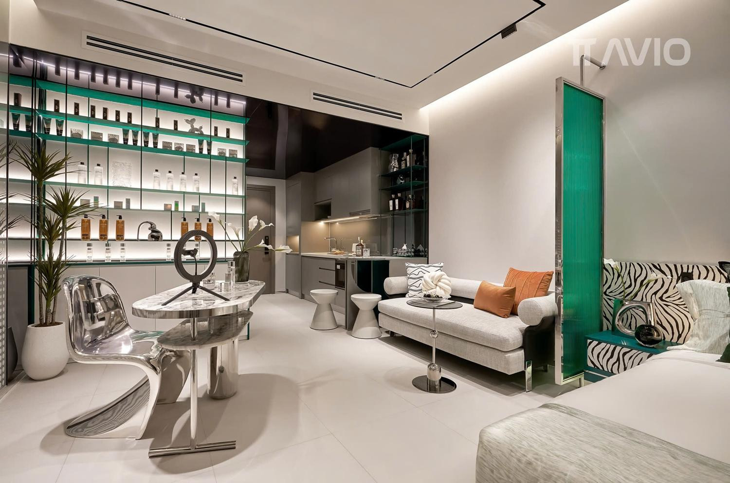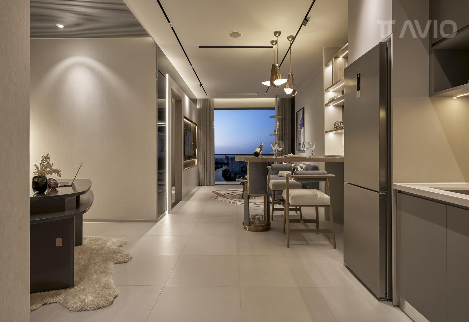 Không gian phòng khách và bếp liên thông căn hộ 1+1 56m2 tại TT Avio Bình Dương