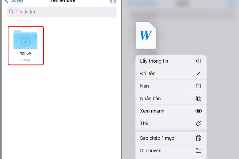 Sau khi truy cập vào mục “Trên iPhone”, bạn sẽ thấy thư mục “Tải về” (Downloads). Đây chính là thư mục tải về iPhone mặc định cho hầu hết các file bạn đã lưu từ trình duyệt web hoặc các ứng dụng khác. Nhấn vào thư mục “Tải về” và bạn sẽ thấy danh sách các file đã được lưu. Nếu muốn xem thêm các tùy chọn khác như chia sẻ, di chuyển hoặc xóa tệp, bạn chỉ cần giữ ngón tay trên tệp đó cho đến khi menu ngữ cảnh hiện ra.