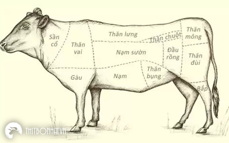 Sơ đồ phân biệt vị trí gầu bò và nạm bò trên thân con bò, giúp xác định gầu bò nằm ở đâu chính xác