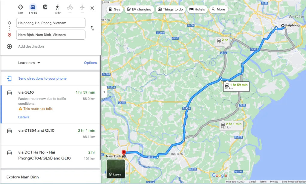 Khoảng cách từ Hải Phòng đến Nam Định theo Google Maps