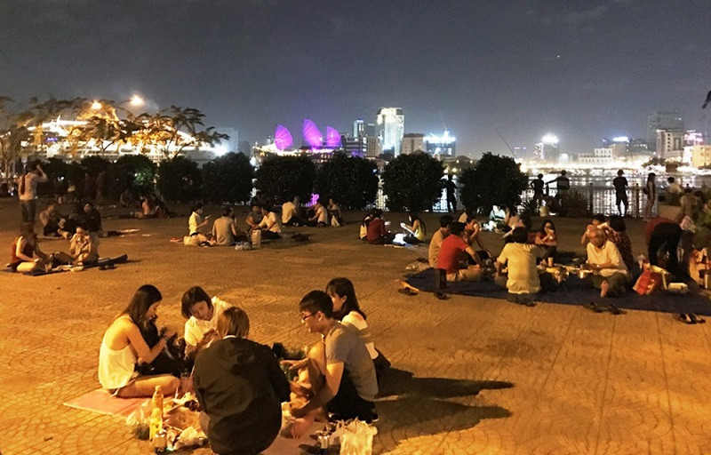 Khi đêm về, khu vực nóc hầm Thủ Thiêm lại khoác lên mình một vẻ đẹp khác, lung linh và sôi động hơn. Từ khoảng 18h mỗi ngày, nơi đây bắt đầu nhộn nhịp với dòng người đổ về để thư giãn, hóng mát, thưởng thức cà phê và các món ăn vặt đường phố. Nhiều gia đình và nhóm bạn còn mang theo chiếu, bạt để ngồi gần bờ sông, tận hưởng làn gió mát lành và trò chuyện. Không khí buổi tối tại đây rất ấm cúng và thân thiện, tạo nên một không gian giải trí ngoài trời độc đáo cho người dân Sài Gòn.