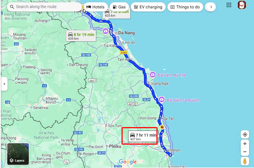 Bản đồ chỉ dẫn đường từ Huế đến Quy Nhơn với quãng đường 405km trên cao tốc