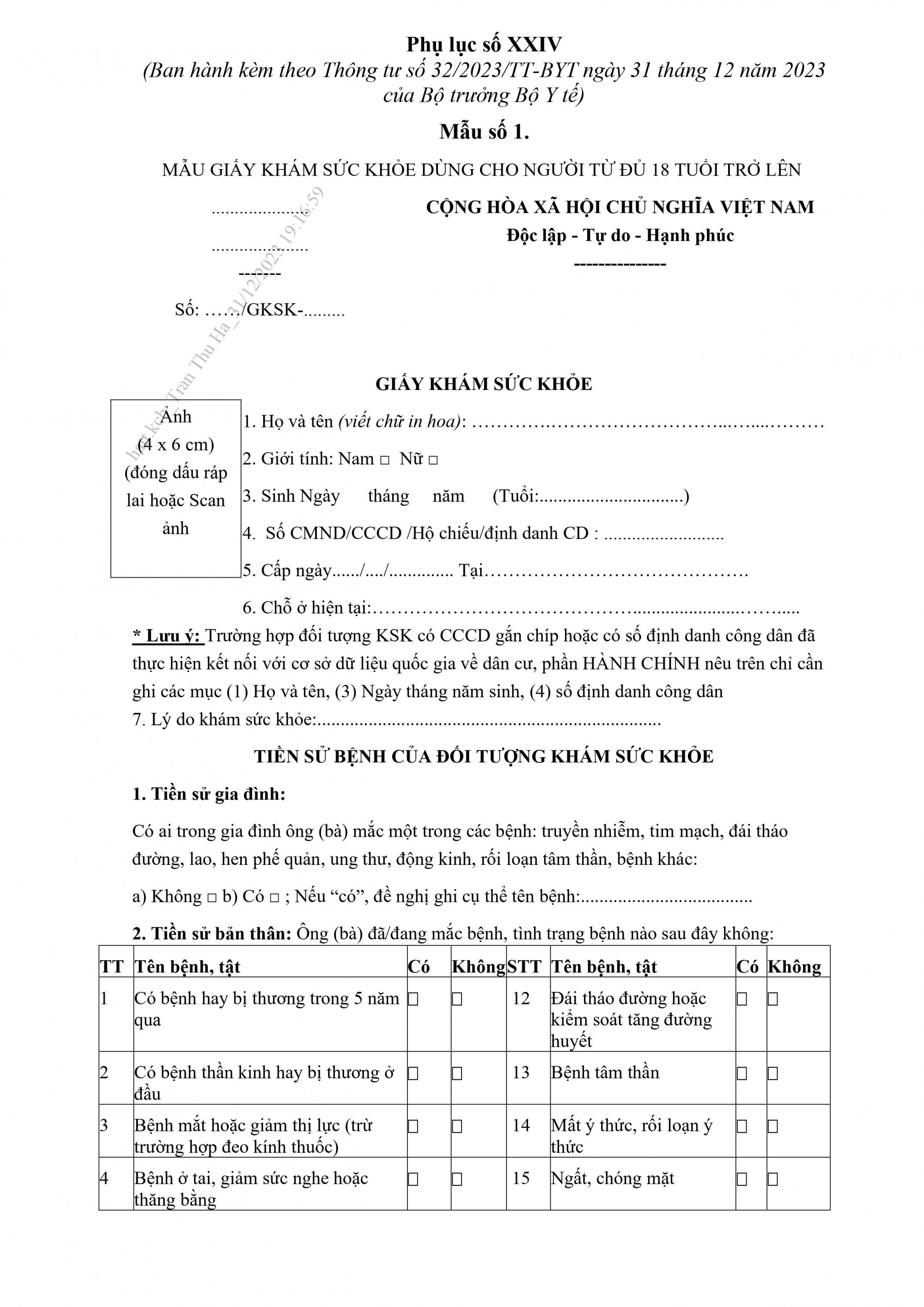 Theo quy định hiện hành, đặc biệt là Thông tư 32/2023/TT-BYT, mẫu giấy khám sức khỏe dành cho người xin việc đã được chuẩn hóa. Đối với người lao động từ đủ 18 tuổi trở lên, cần sử dụng Mẫu số 01 Phụ lục số XXIV. Giấy khám này yêu cầu phải dán ảnh chân dung kích thước 4cm x 6cm với nền trắng, được chụp trong vòng 6 tháng gần nhất.