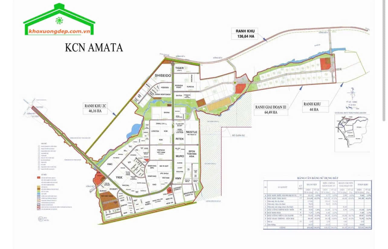 Bản đồ quy hoạch chi tiết Khu công nghiệp Amata Biên Hòa, thể hiện các khu vực sản xuất và tiện ích