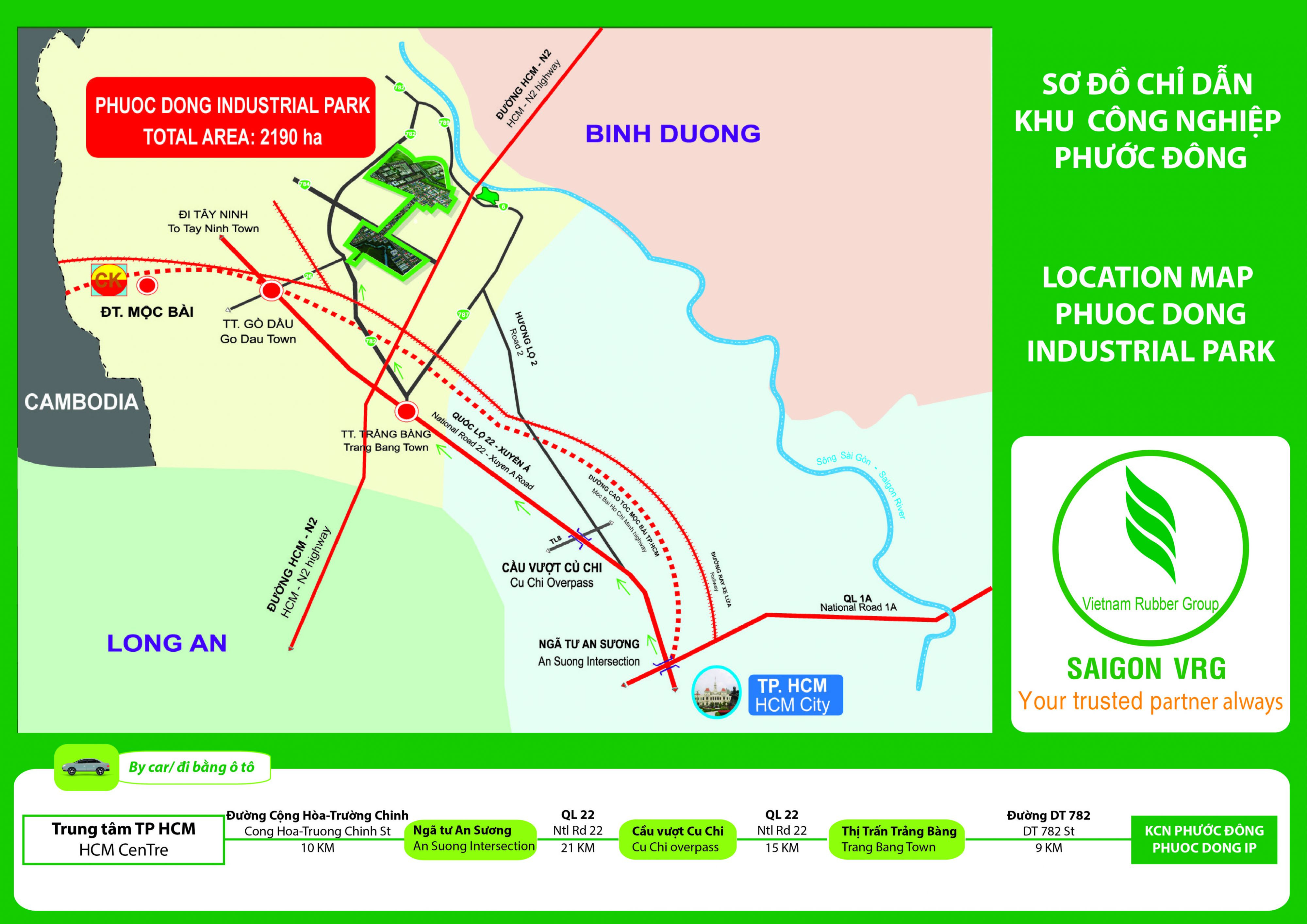 Một trong những yếu tố cốt lõi tạo nên giá trị của Khu công nghiệp Phước Đông chính là hệ thống giao thông và khả năng kết nối vùng vượt trội. Khu phức hợp này nằm gần đường dẫn vào tuyến Cao tốc TP. Hồ Chí Minh – Mộc Bài dự kiến hoàn thành vào năm 2025, mở ra cơ hội giao thương và vận chuyển hàng hóa nhanh chóng. Từ KCN Phước Đông, chỉ mất khoảng 60 km (100 phút) để đến TP. Hồ Chí Minh qua QL22, 14 km (20 phút) đến cảng trung chuyển Thanh Phước – nơi vận chuyển hàng hóa đi cảng Cát Lái, và 20 km (30 phút) đến Cửa khẩu quốc tế Mộc Bài, cửa ngõ quan trọng đi Campuchia. Tỉnh Tây Ninh còn có đường biên giới dài 240 km với 3 cửa khẩu quốc tế chính là Mộc Bài, Xa Mát, Tân Nam cùng nhiều cửa khẩu phụ, tạo điều kiện thuận lợi tối đa cho hoạt động xuất nhập khẩu và logistics.