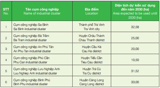 Bảng thông tin các Cụm công nghiệp Trà Vinh theo quy hoạch