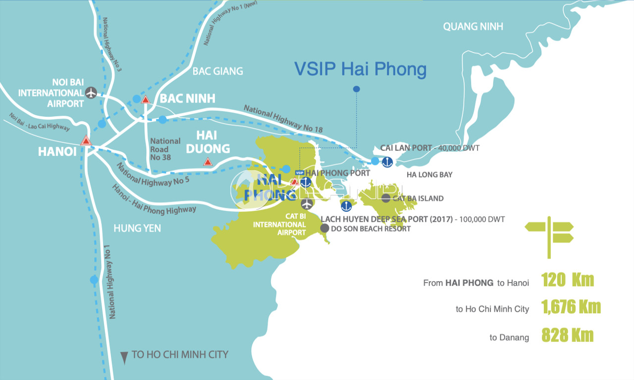 Sơ đồ vị trí Khu Công Nghiệp VSIP Hải Phòng với các tuyến giao thông trọng điểm và cảng biển