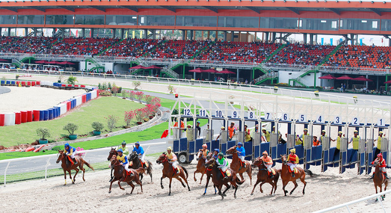 Những chú ngựa mạnh mẽ trên đường đua tại Khu Du Lịch Đại NamTrường đua ngựa quy mô lớn tại Đại Nam là điểm nhấn thể thao hấp dẫn, thu hút người hâm mộ và khách du lịch, góp phần tăng cường giá trị thương mại cho các bất động sản xung quanh.
